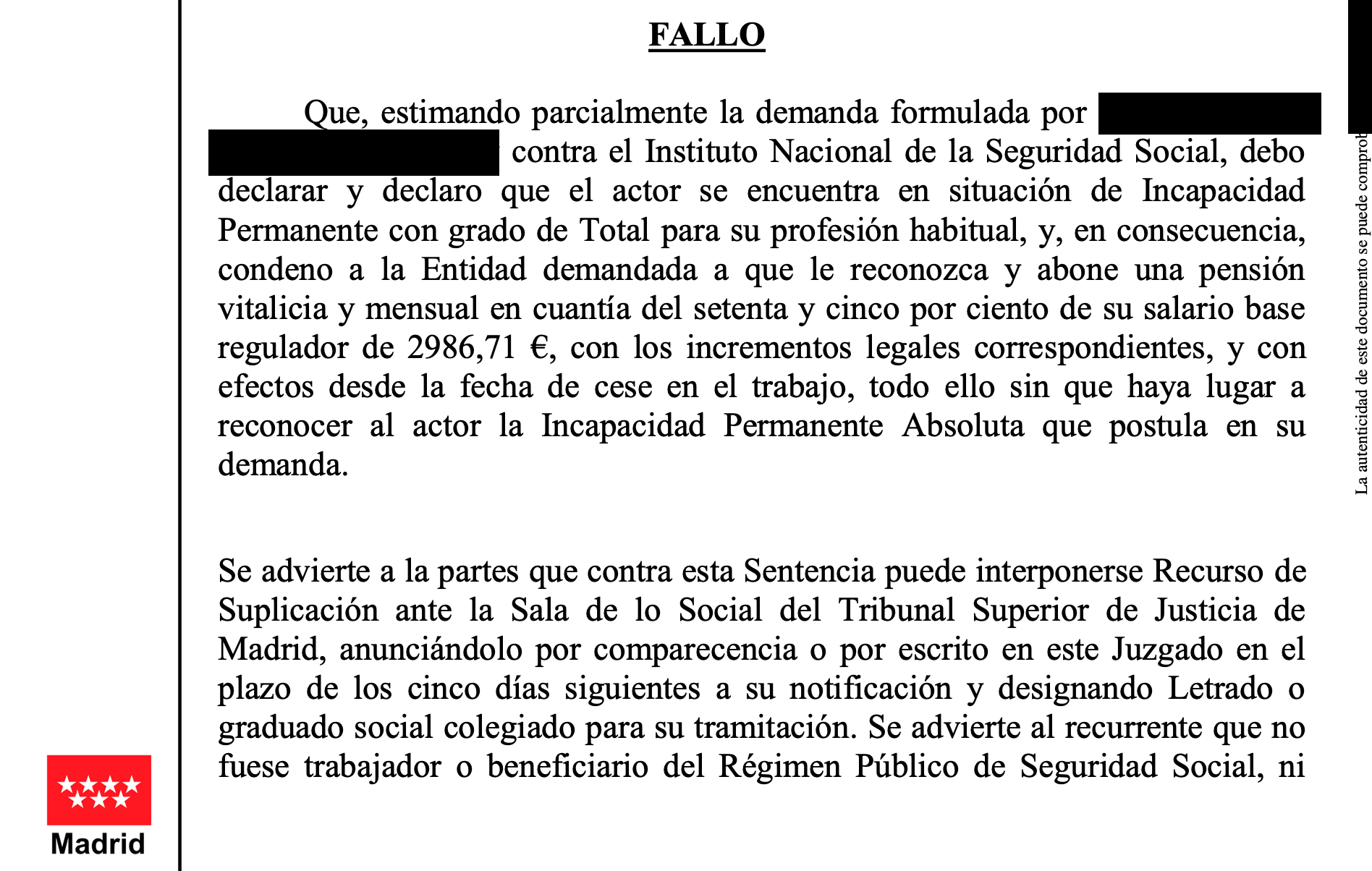 Finalmente, el juzgado estimó parcialmente la demanda y reconoció al trabajador una Incapacidad Permanente Total para su profesión habitual, con derecho a percibir una pensión vitalicia de la Seguridad Social equivalente al 75 % de su base reguladora.