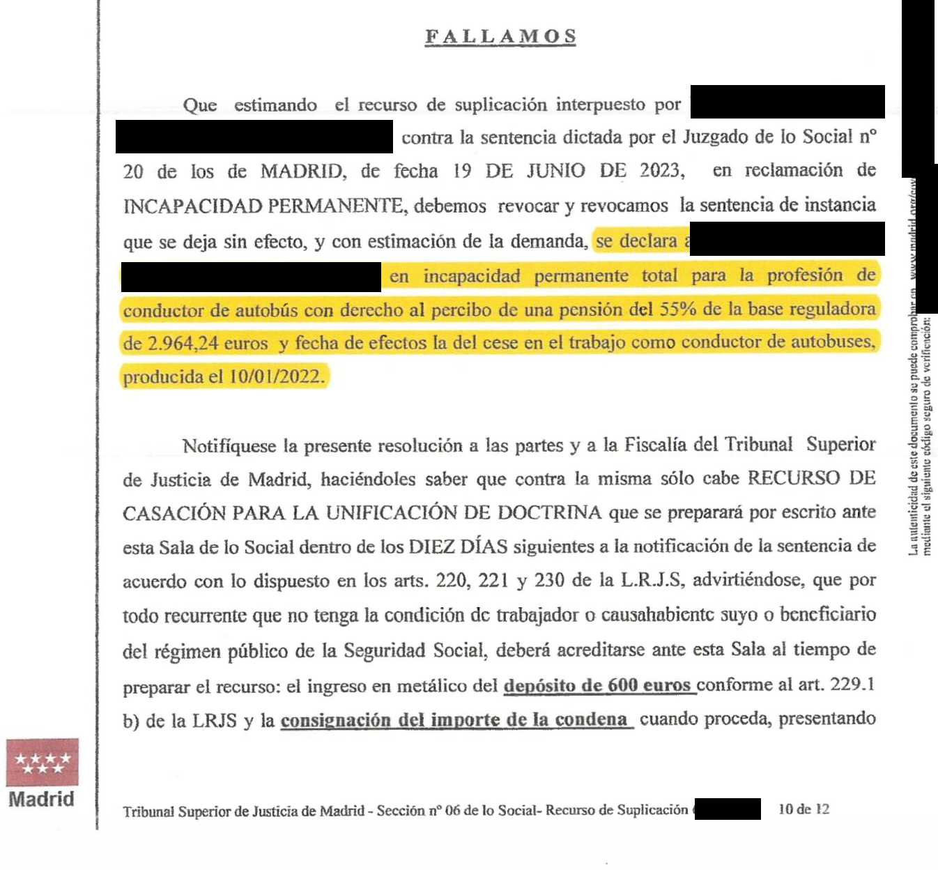 Tras la intervención de nuestro despacho y el análisis detallado de la documentación médica, el tribunal concluyó que las patologías lumbares del trabajador generaban limitaciones funcionales incompatibles con el desempeño de su profesión habitual, especialmente por la imposibilidad de mantener posturas prolongadas y realizar las exigencias físicas propias de la conducción de autobuses.